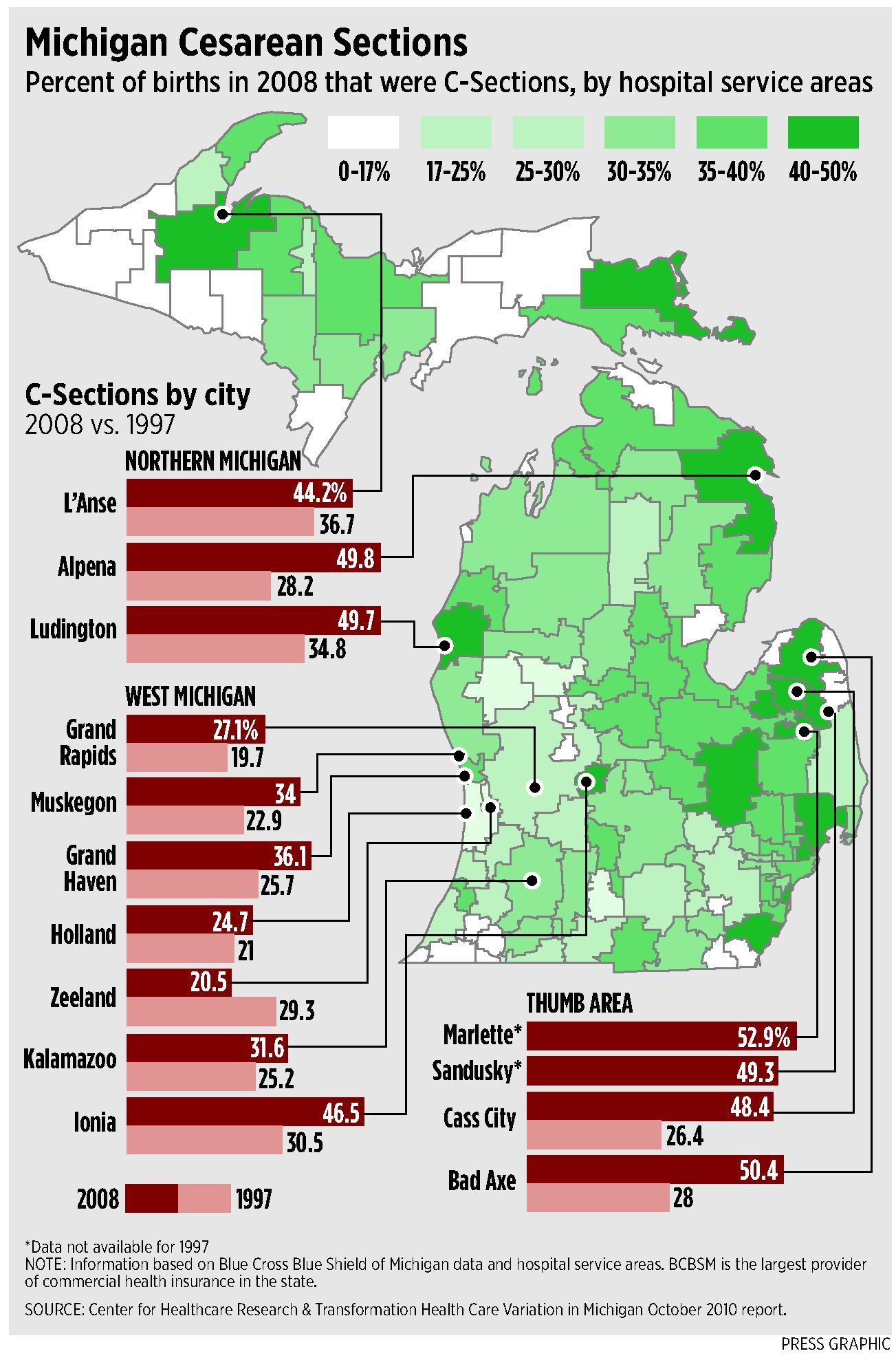 You can look at the whole state if you like, but I’m focusing in on one area.  Alpena and Iosco (if you don’t know where that is, find the thumb of Michigan, then follow the hand up the index finger, see that white area?  Yup keep going up, the two green areas just above but still next to lake Huron, those are the areas I’m talking about.  Iosco is the first one you come to, and has a c-section rate of 35-40% if I can judge those colors correctly, which means that they are above the national average.  Alpena is the darker green area with a rating of 40-50%, or if you look at the dark red bar connected to it you’ll see that more accurately it has a rate of 49.8%, which is way too close to 50% for my comfort.